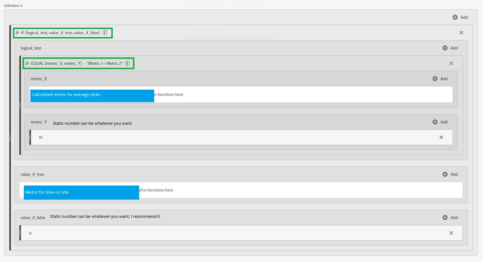 If I build a calculated metric, let's say average clicks per session for sessions that hit xyz page. I get my output in the freeform and it says 15 clicks, I then want to see the time on site for users who met the criteria of 15 clicks on average. I thought I could create a segment for that group with that value but I'm not having any luck. Am I trying to do something that simply isn't possible to do in Adobe Workspace? Seems like that was the case years ago (based on the post), but is that still the case? Any suggested workarounds?