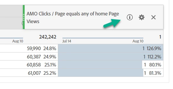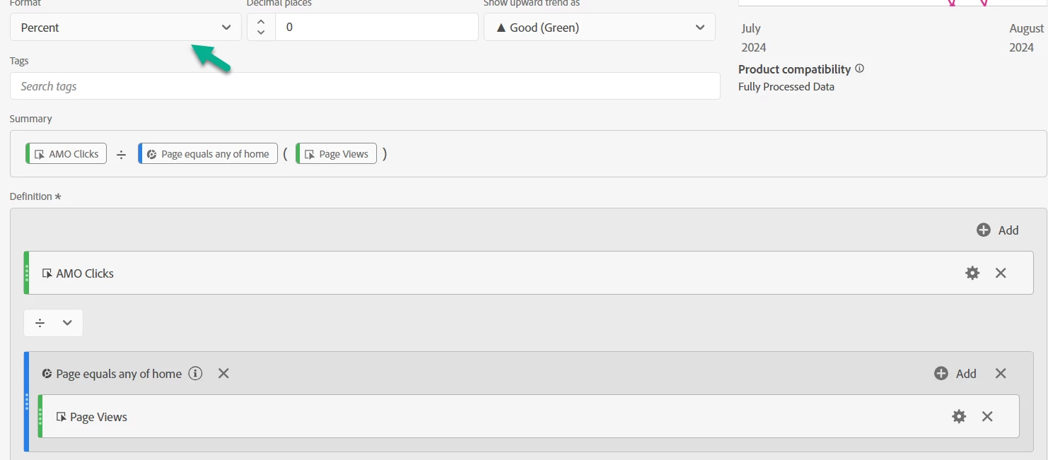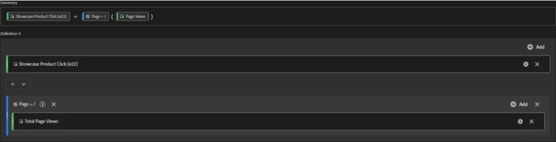 The metric we're trying to build would be calculated considering total page views where page equals '/' as denominator, and not page views that are persisted after the Showcase Product (v9) metric is registered, which is the value considered when I'm building the calculated metric: