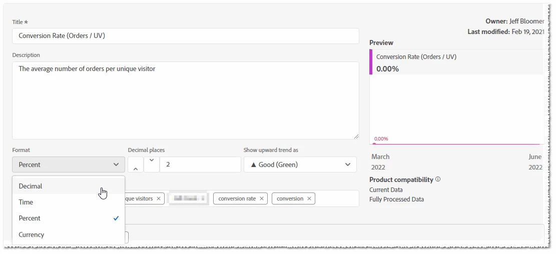 @jane_120 Can you please ensure that you are using decimal while creating this calculated metric? The calculated metrics setting allows you to change the formatting (i.e. decimal, percent, etc.) to present in the desired format on the workspace dashboard. You can check this documentation for your reference