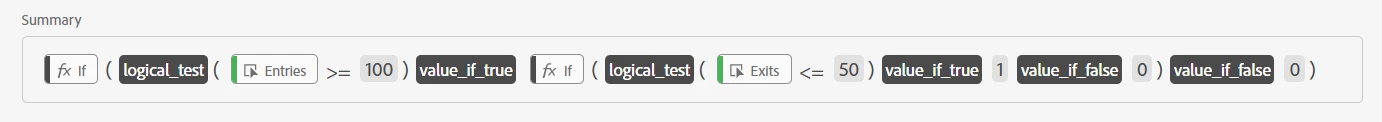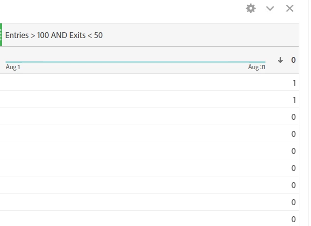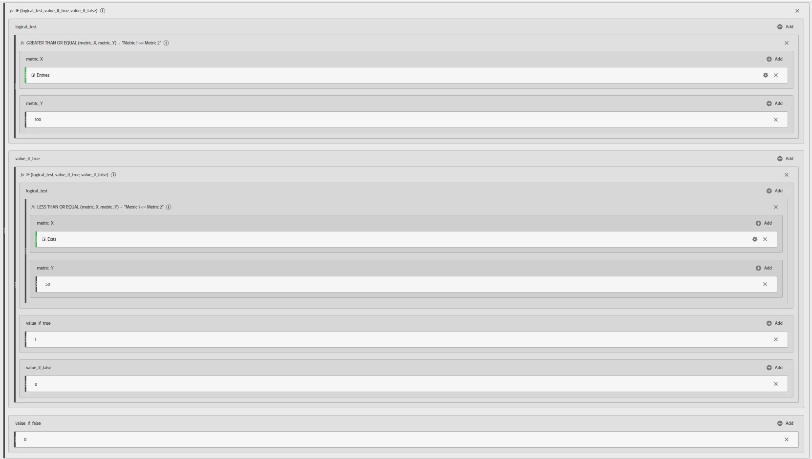 It would be great if I use Greater Than or Equal To X then join it with an AND Less Than or Equal To Y. But I don't see a straightforward way of doing that in the builder (please correct me if I am mistaken). In lieu of that, is there a BETWEEN like function or approach I can take in the builder? For sake of example let's say I wanted the freeform panel to show me pages that have more than 100 entries and exits lower than 50, how can I achieve this metric? Or if you think there's a better approach than going the calculated metric route please let me know.