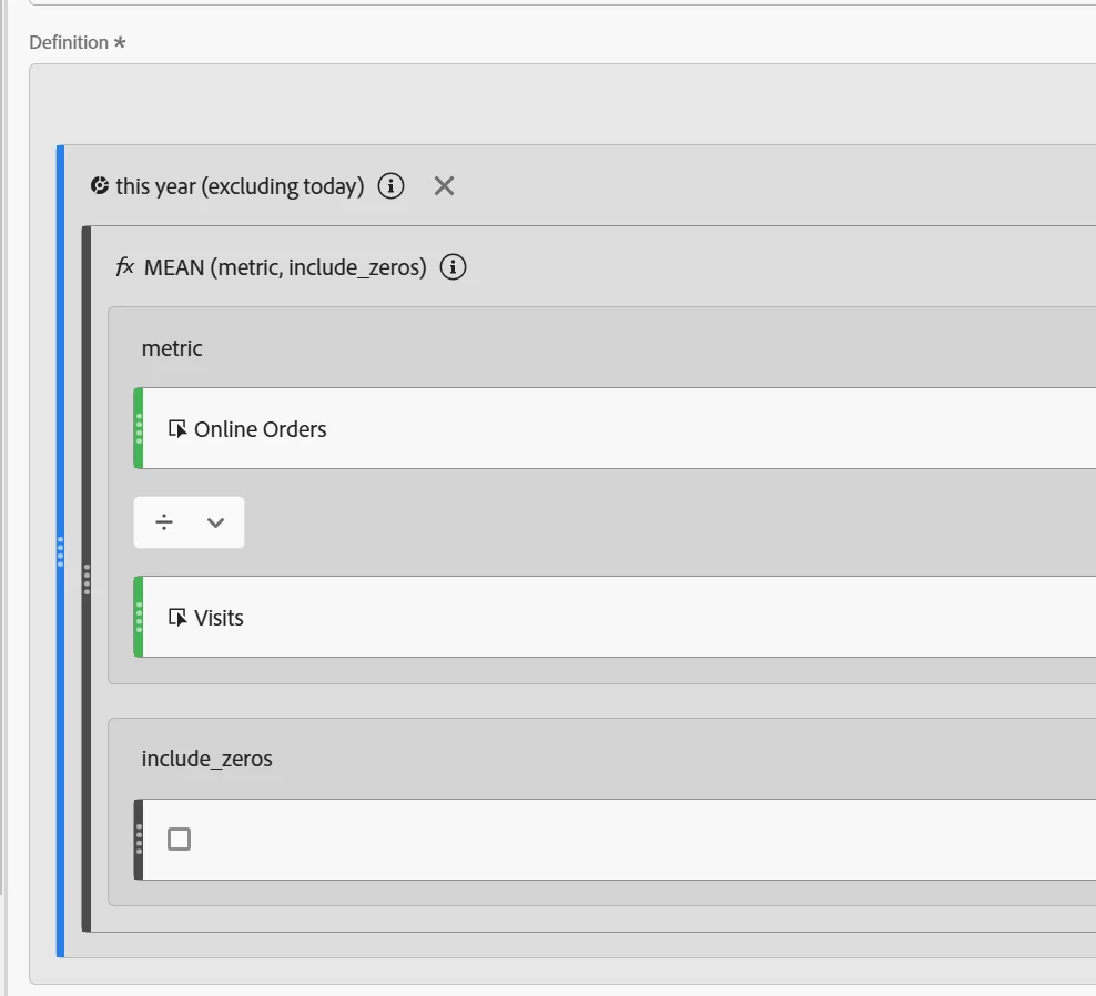 You can use the mean function with a date range in a segment instead. You mentioned wanting year to date, so I put the date range "this year excluding today" into a segment so we can use it in a calculated metric (first screenshot). Then you add the segment to the metric, bring in the "mean" function, and put your metric of interest (booking rate) inside of it. It doesn't make a difference here if you include 0's or not, unless you have days where the booking rate is 0.