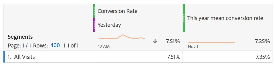 You then put that metric in your table and instead of calculating a different average for each day as time goes on, it will calculate the average for the YTD total. You can put it against something like "all visits" and use a second column with yesterday's conversion rate to compare just the last day. Or, you can use the date dimension and look at each date compared to the average. The only callout with that is that the average is going to be for the whole YTD, not from the start of the year up to that specific date.