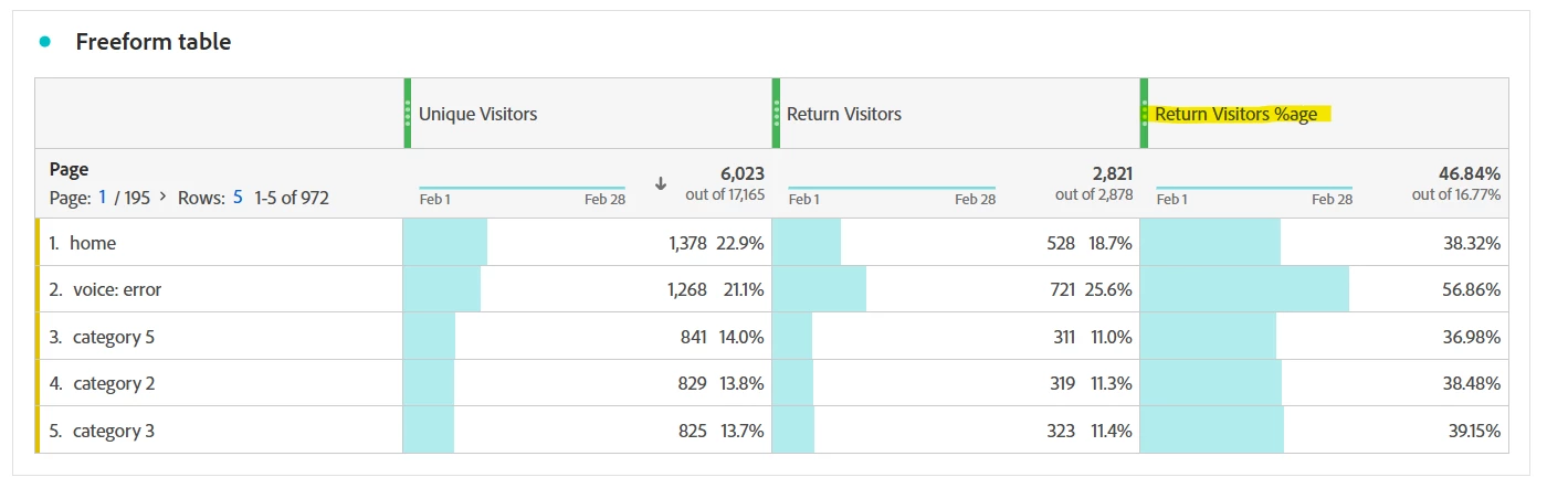 There is a page type on my site called "TXT." I want to know what percent of visitors on a TXT page are repeat visitors.