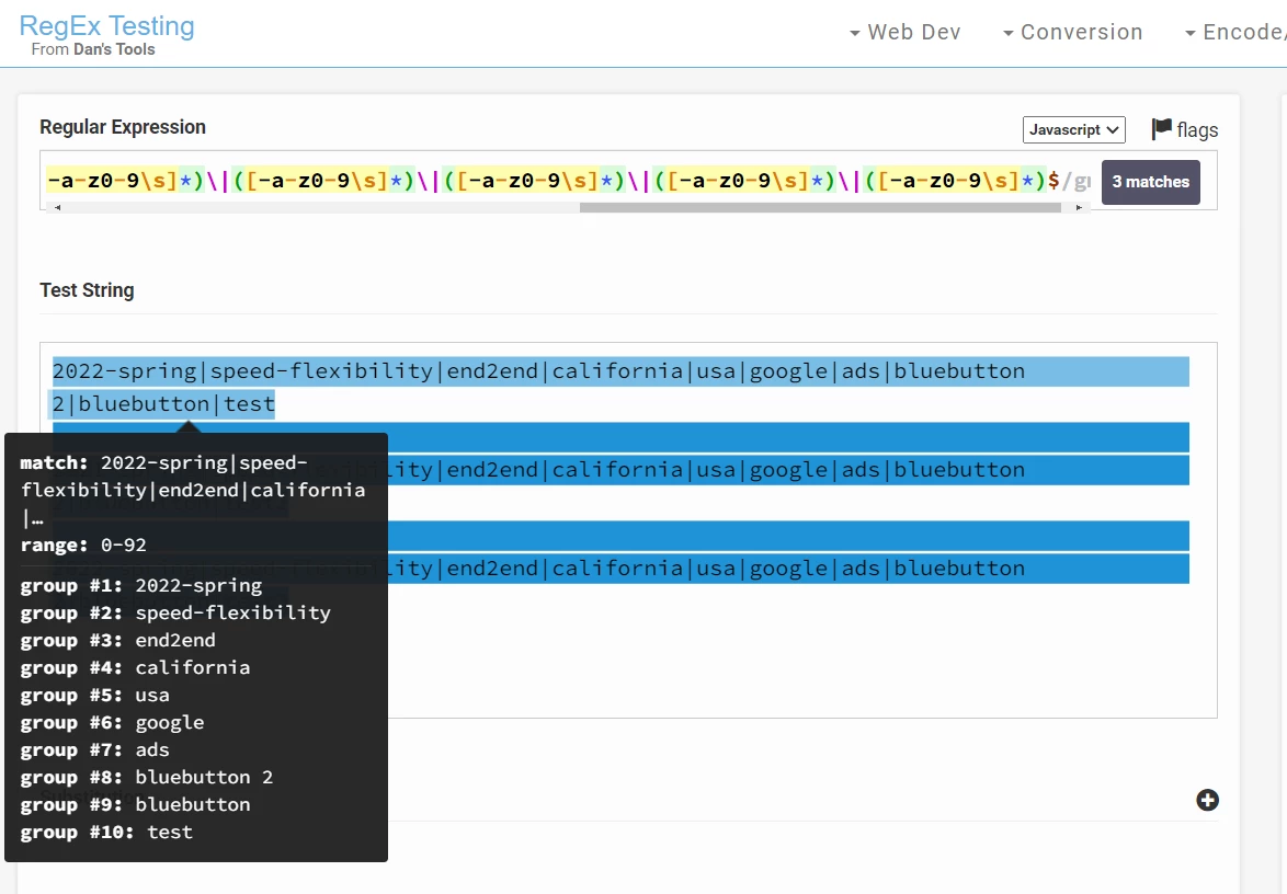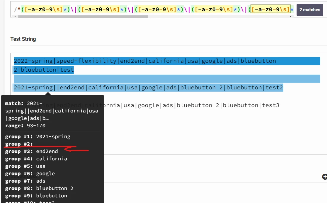 However, IF you are missing one of the values, and actually have "2022-spring|end2end|california|usa|google|ads|bluebutton 2|bluebutton|test3" instead of "2022-spring||end2end|california|usa|google|ads|bluebutton 2|bluebutton|test3" you could experience parsing issues or data falling into the wrong classification.