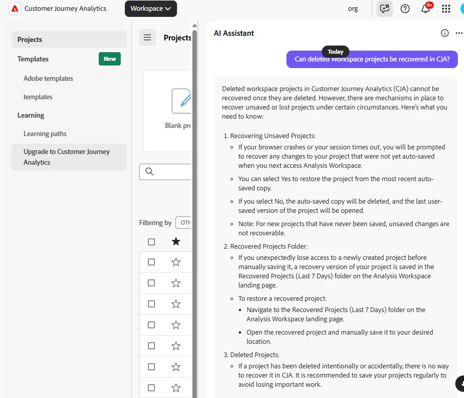 Can deleted Workspace projects be recovered in CJA?