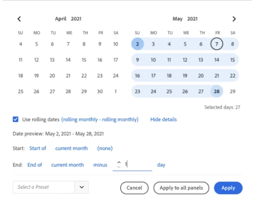 Are you using a rolling date range for the panel? If that's correct, can you please try entering the manual value in the date range again and saving the changes to see if "Compare Time Period" works? For example, in the rolling date below, the "1" in the end formula needs to be re-entered and then "Apply". Once it is done, try running "Compare time period" again.