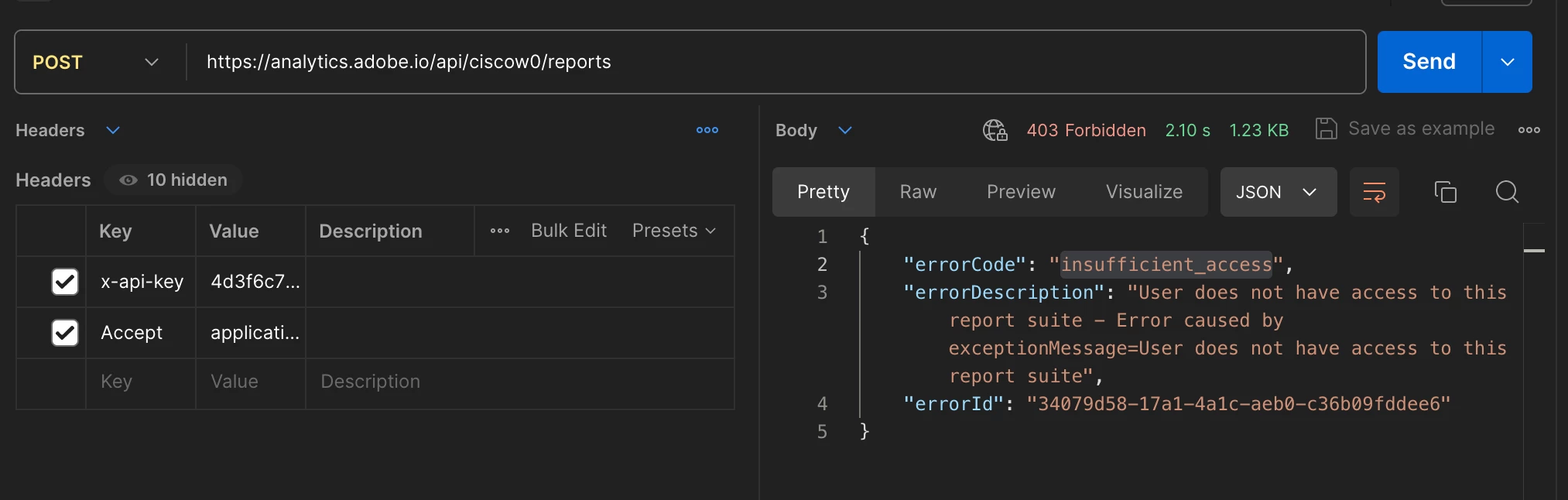 "errorDescription": "User does not have access to this report suite - Error caused by exceptionMessage=User does not have access to this report suite"