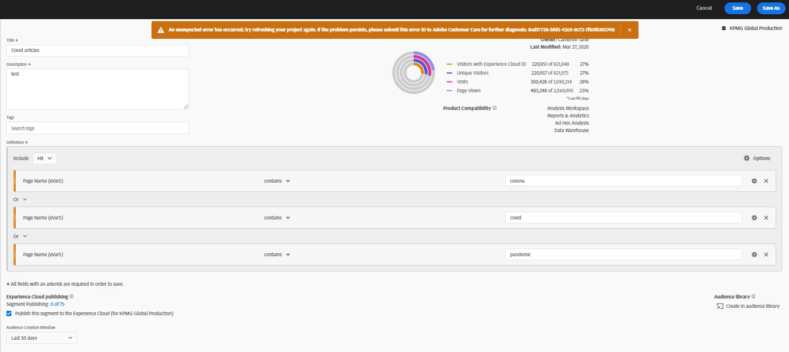 I have on this enterprise Adobe Target and Adobe Analytics, and A4T. Additionally I have admin access, the report suites are set up, I even can see the check box indicating I can publish to experience cloud. But when I try to publish, and save, a segment in workspace, I get an error. I would create a support ticket but creating a ticket makes an error occur too!