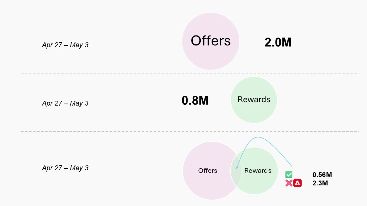 Result: When the global project date range filter is restricted to a specific week, the result is as expected - I get around 560K people. However, when this date range is expanded, the result balloons to over 2.3M, which is obviously incorrect, since the max cannot exceed the minimum size of these two audiences, which is around 820K.