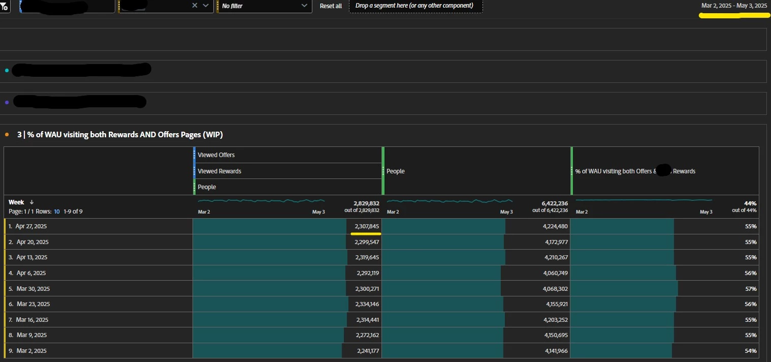What did I try?: I created two filters - one for Persons visiting the "Offers" path, and another for the "Rewards" path. I then created a Freeform table, with Week as the table index, and People as the metric. Lastly, I stacked both filters on the People metric, with the intention of filtering people who visited BOTH "Offers" and "Rewards" pages by week.