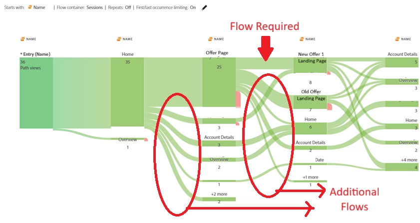 I need to create user journey flows for session with a specific condition where users have interacted with an offer. So, I have created a flow visualization where flow container is 'Session' and 'starts with' dimension as Page Name.