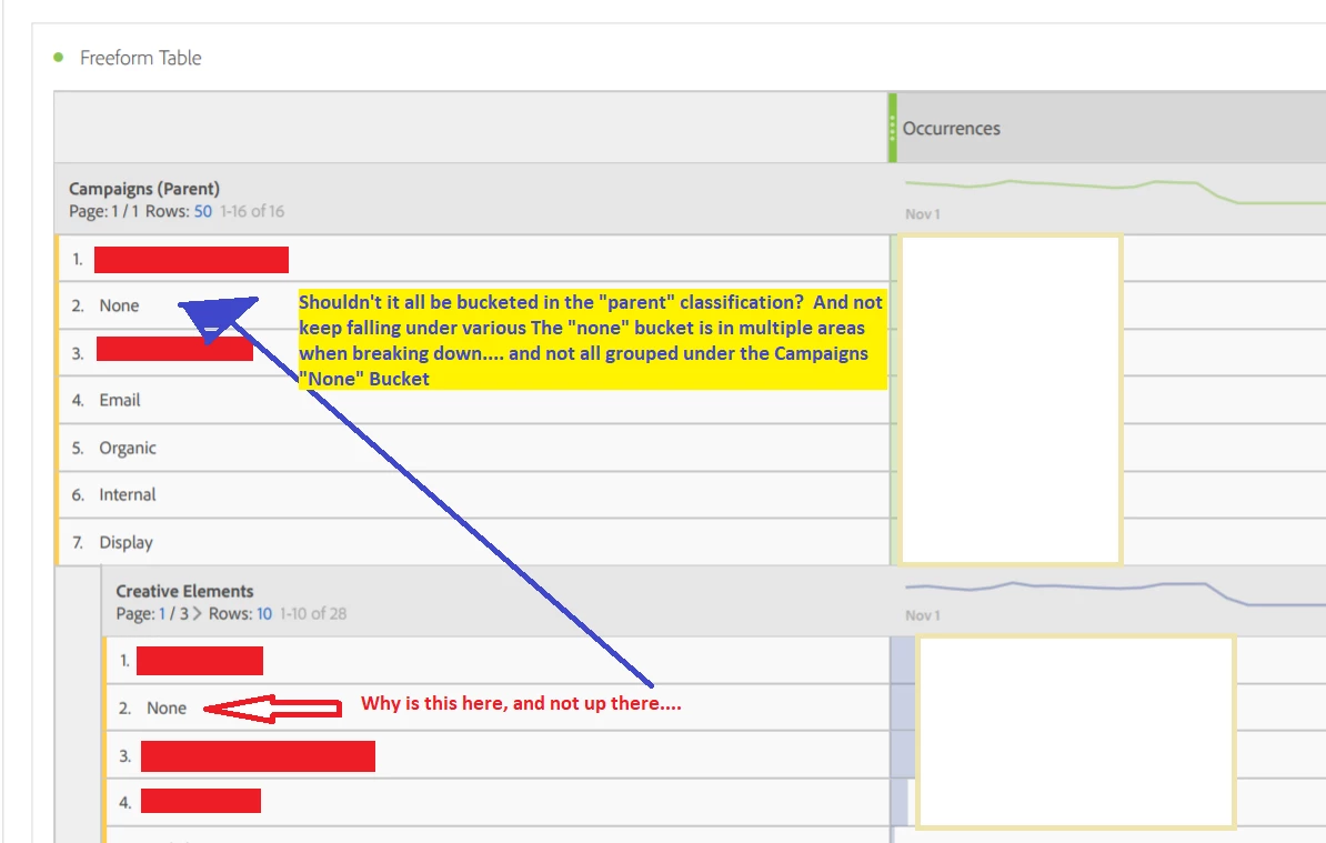 Classification Rule Builder Snafu: None Bucket in Creative Elements - and not grouped under none bucket for Parent Classification/Rule i.e. Campaigns Parent. How is this possible?