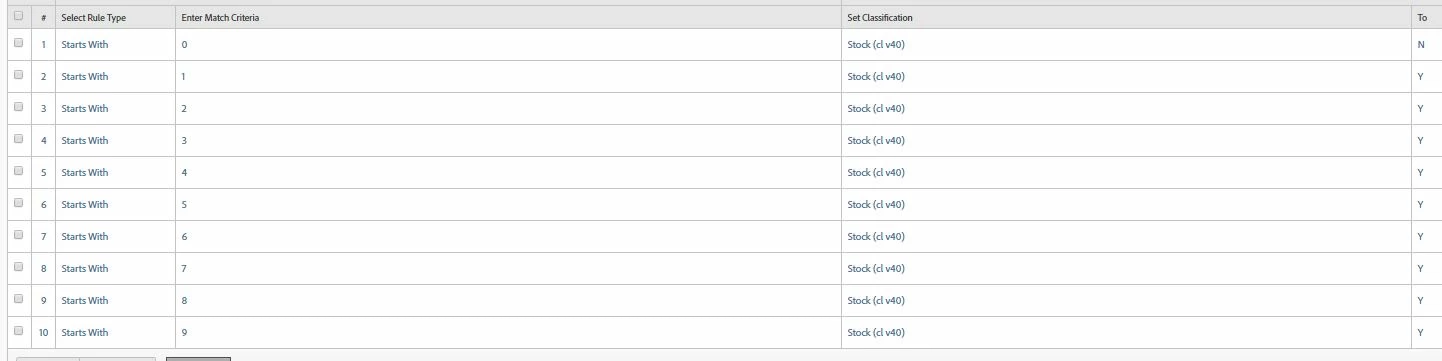 I need tt classify the stock position as Y(if value > 0) or N (if value = 0). Since numeric classification is not available, I tried a brute force approach - creating 10 rules with "starts with" (see screenshot).