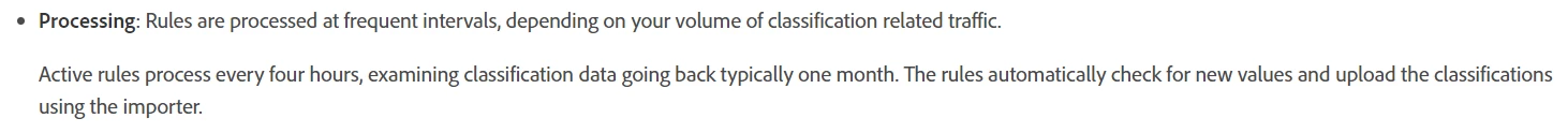 I saw the document says it processes every four hour, but it seems that its longer than four hour. (https://experienceleague.adobe.com/docs/analytics/components/classifications/classifications-rulebuilder/classification-quickstart-rules.html?lang=en)