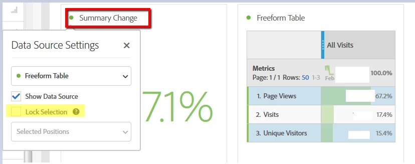 How do I modify the "Summary Change" visualization so that it allows me to compare other metrics and not take the default?