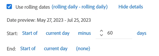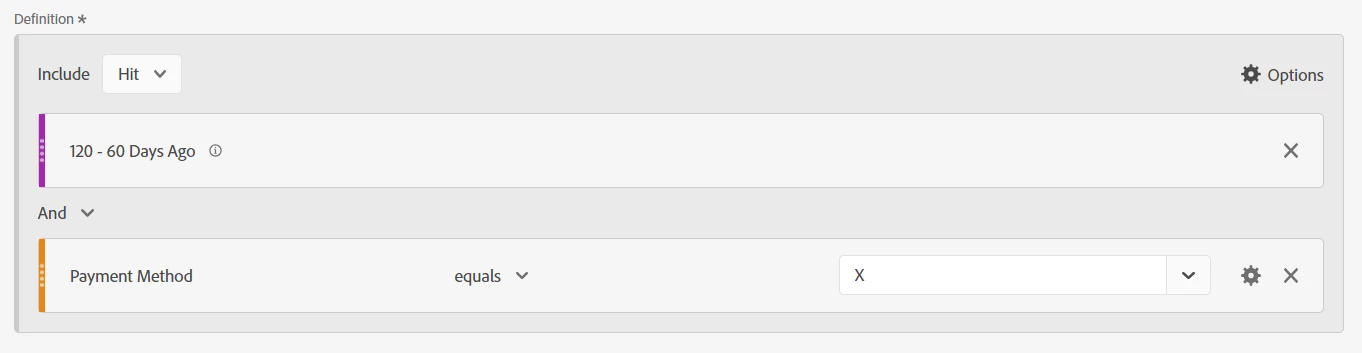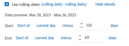 I believe what I'm trying to accomplish is possible, but I'm having trouble setting it up in Workspace. What I want is for the segment to look back from today minus 60 through 120 days to identify a population of customers that had a specific payment method. Once the population is identified, I want to look back the past 60 days on that same population to see how it has fared in the last 60-days. The tricky part is identifying the population in one date range (minus 60-120 days from today) and then showing metrics for that population in another date range (minus 1-60 days from today) within the same segment.