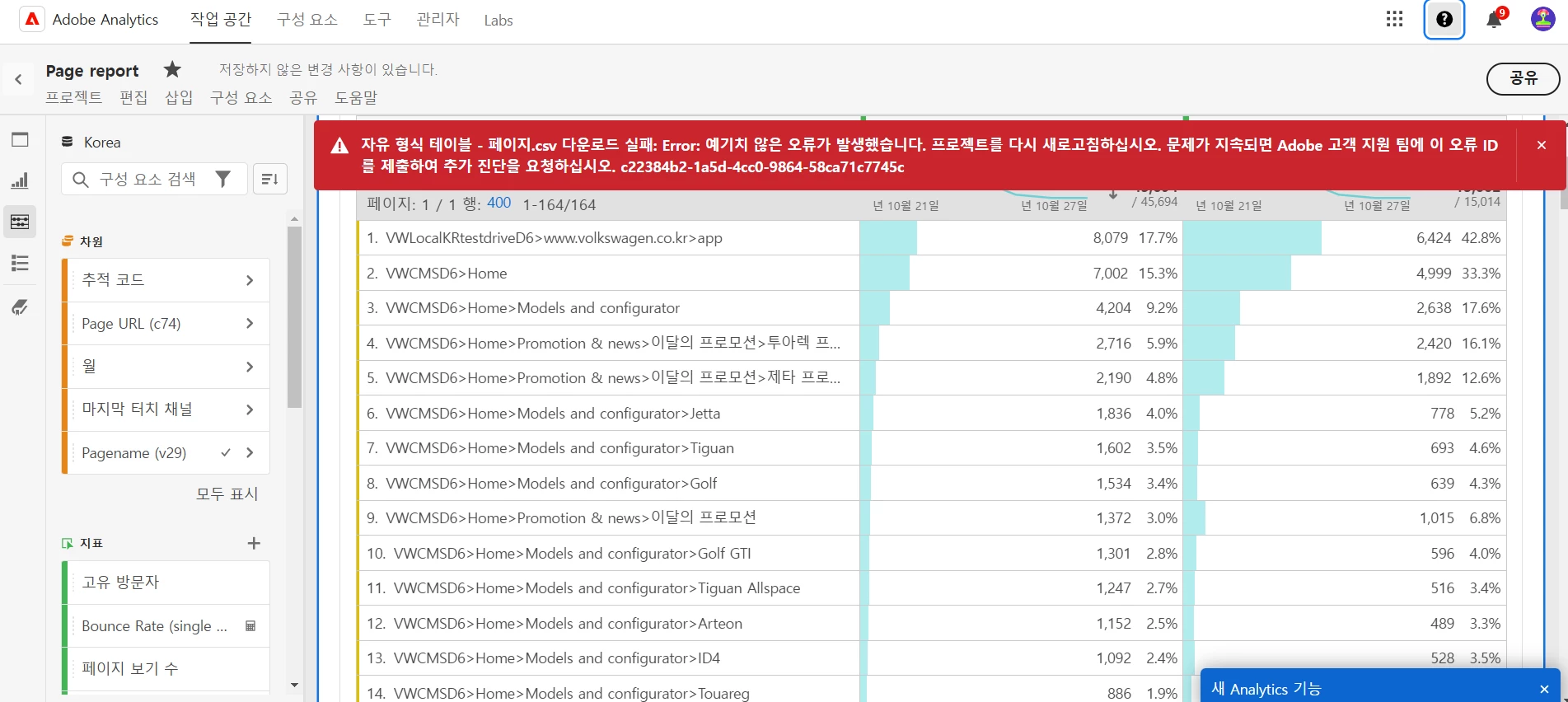 자유 형식 테이블 - 페이지.csv 다운로드 실패: Error: 예기치 않은 오류가 발생했습니다. 프로젝트를 다시 새로고침하십시오. 문제가 지속되면 Adobe 고객 지원 팀에 이 오류 ID를 제출하여 추가 진단을 요청하십시오. c22384b2-1a5d-4cc0-9864-58ca71c7745c