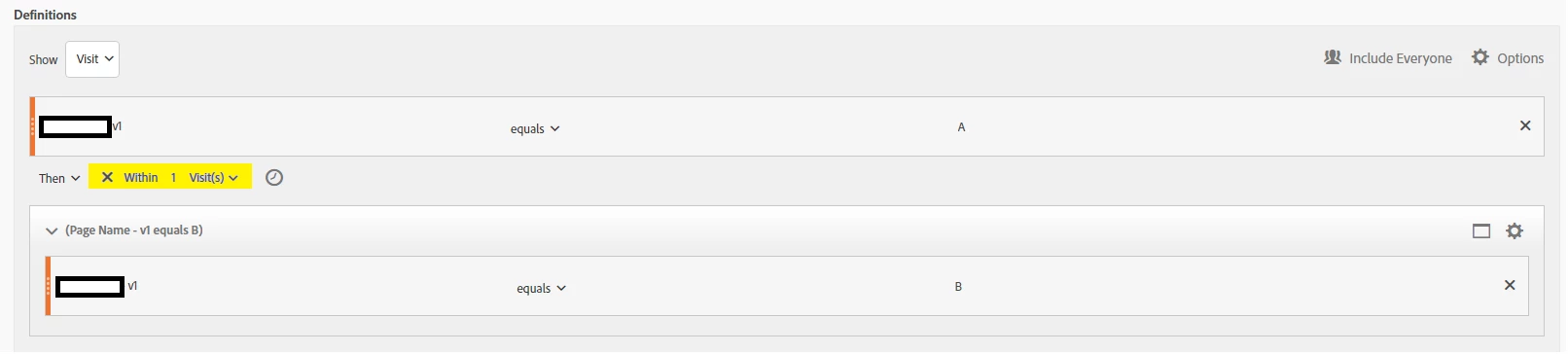 I'm having some problems in getting results with a segment that should give me the visits whenever a visit sends an eVarX with a specific value (let s say A) in one page, then another value on the next page (lets say B) :