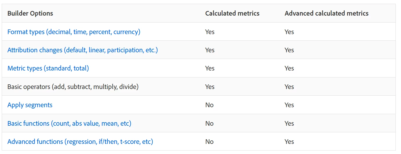 The link below breaks down what is in calculated metrics and what is in advanced calculated metrics, and which SKU has which type.