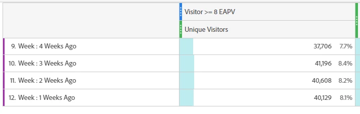 I have a table which shows how many unique visitors viewed >= 8 pages per week.