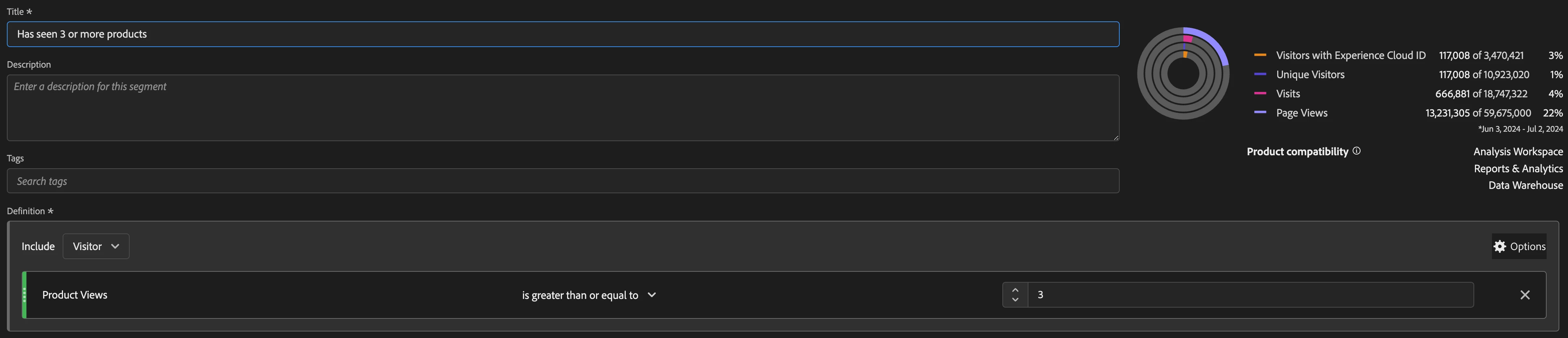 Create a segment that tracks visitors with X or more visits on a product detail
