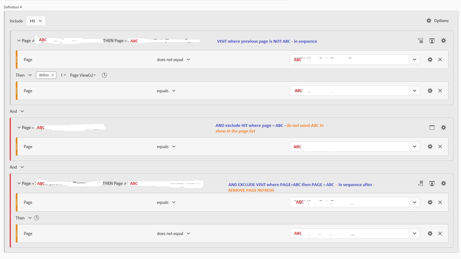 EXCLUDE VISIT where PAGE = ABC then within visit PAGE <> ABC (exclude visit level data for after PAGE ABC) (in sequence)