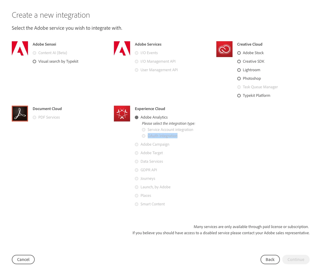 I'm trying to set up OAuth integration for a third-party application, but am running into a similar problem as Creating an oAuth Client - what level of access is required? -- Adobe Analytics can be selected, but the "OAuth integration" option is greyed out: