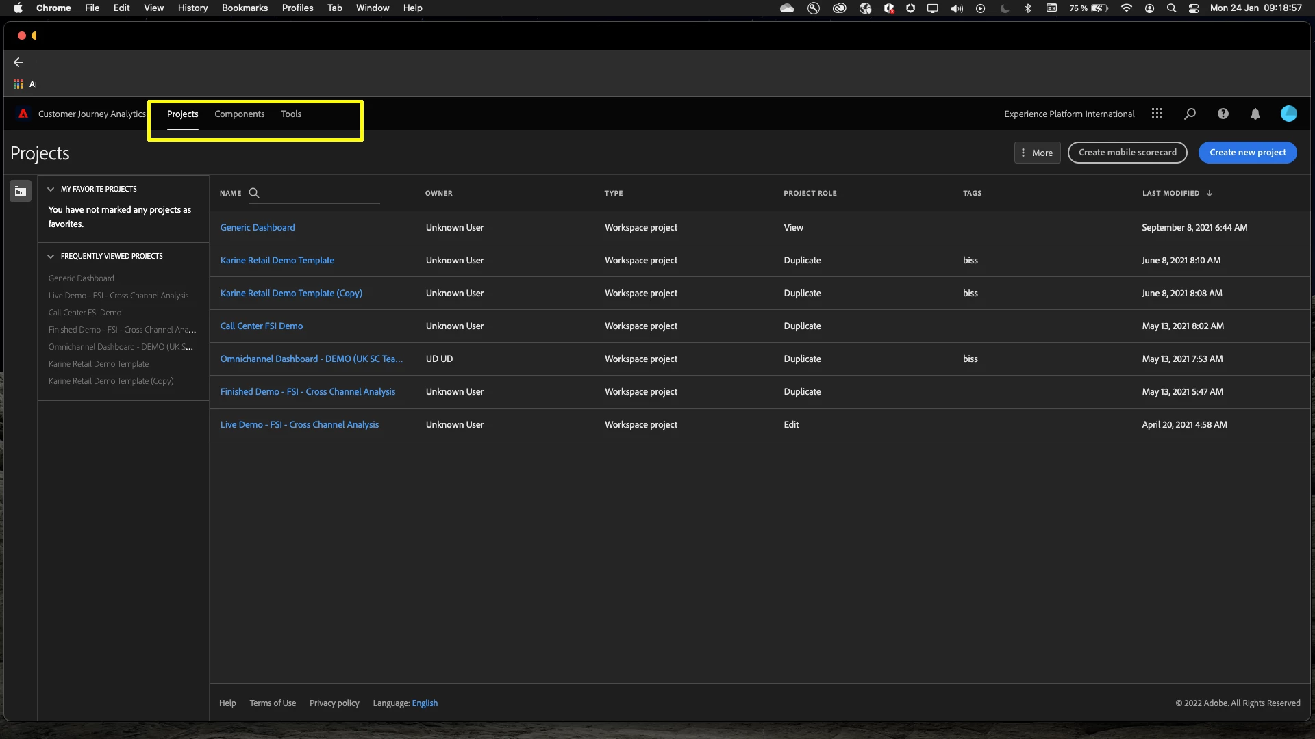 Note currently I can only see the options (Projects, Components and Tools) onto the top menu bar.