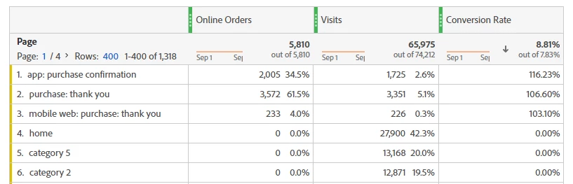 - Solution A: When I use a generic metric (e.g., purchase/visits) and simply drop a page segment (like page "a") on top of it, the results do not come out correctly.