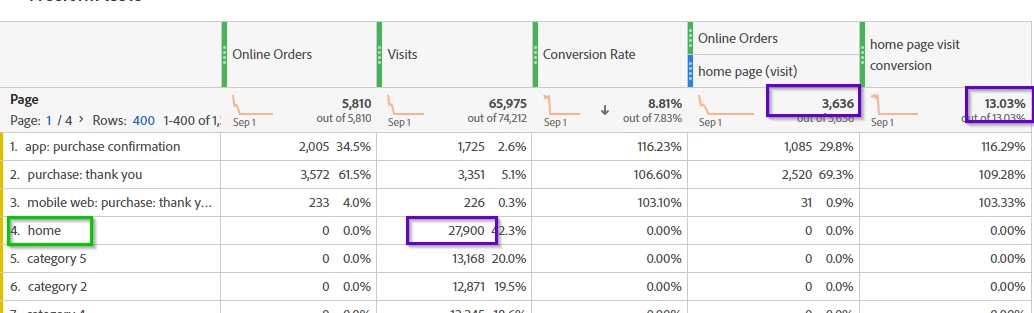 - Solution B: When I create a customized metric specifically for the page (e.g., purchase/page "a" visits), the results are accurate.