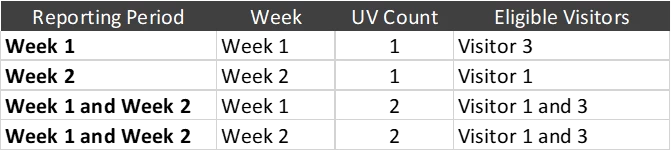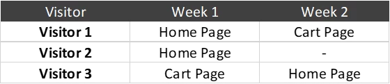 This user will be included in your table, and show in both the Dec 8th week AND the Dec 29th week; despite not having been to the Shopping Cart that week... the user is part of the table data set because they saw the Shopping Cart in the last 4 weeks. However, in the table that only looks at the week of Dec 29th, they didn't hit the Shopping Cart, and so they won't be included in the data.