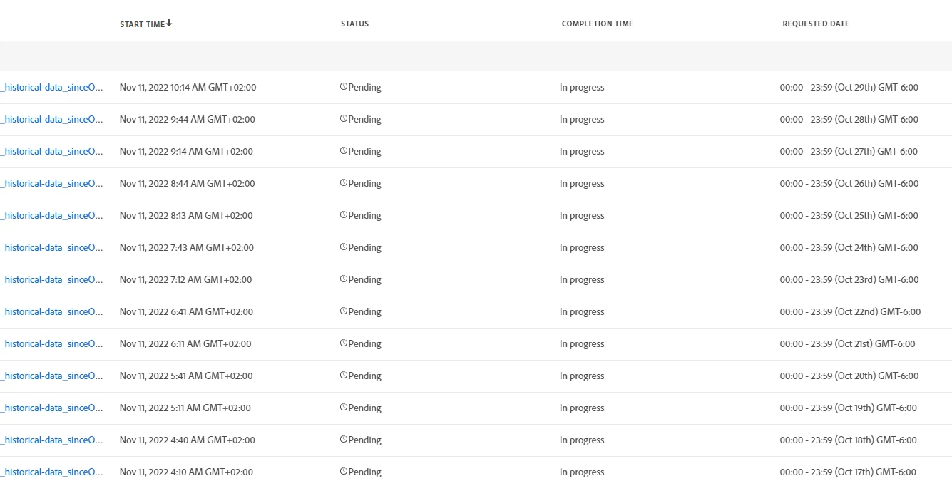 I have created a data feed to FTP to try fetching some historical data from Oct 1st, 2022. It worked well for fetching a few days' data. Then it stopped for some reason, and I noticed the situation of the job list below.