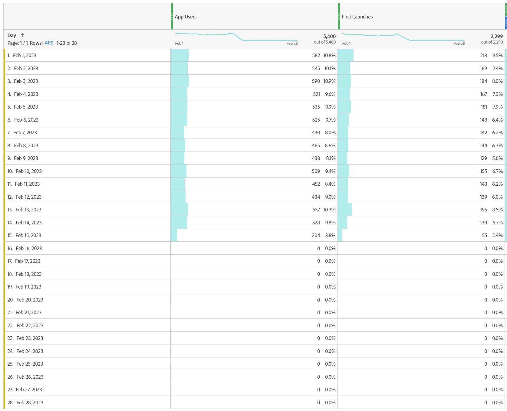 In the table below, the sum of the rows in the App Users column does not total 5,400 when added manually or in excel etc. The First Launches data appears to be accurate.