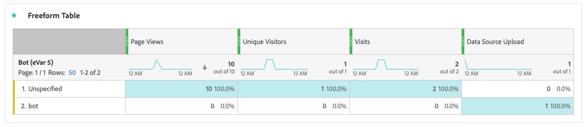 3. In my Analytics report (attached) I see the "Data Source Upload" event registering the hit but I still see my visits listed as "Unspecified" and not "bot".