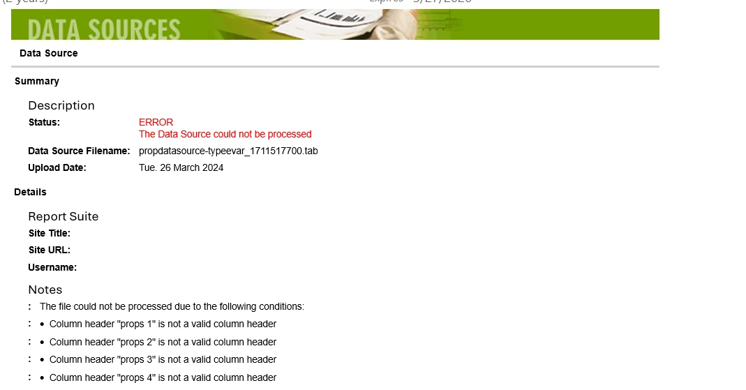 @tomba12In case if you have created data source project, you may receive the email from adobe with the exact reasons for failing the data source upload as below.