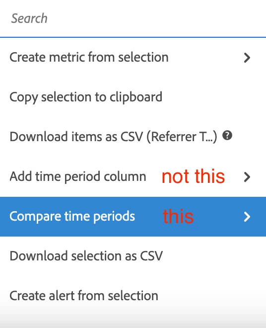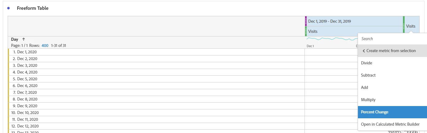 3)At this point no comparison column is added - however I can select all the metrics at the top, right click "Create metrics from selection" and select "Percentage Change".