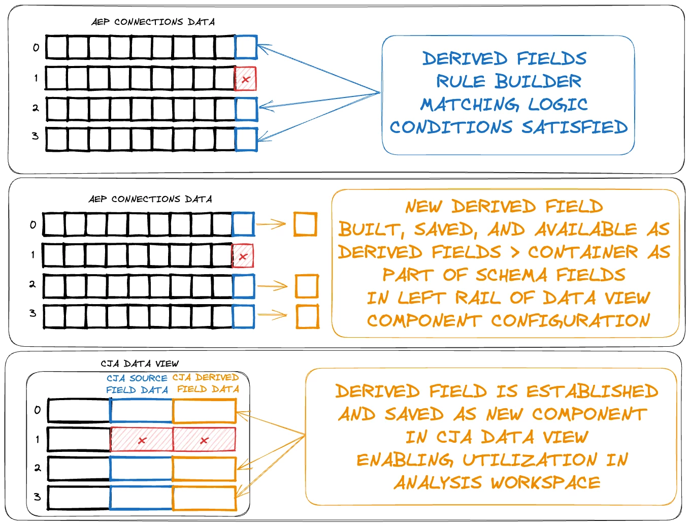 The diagram below outlines the conceptual process that governs derived fields and the finishing process to enable their utilization within a CJA Data View.