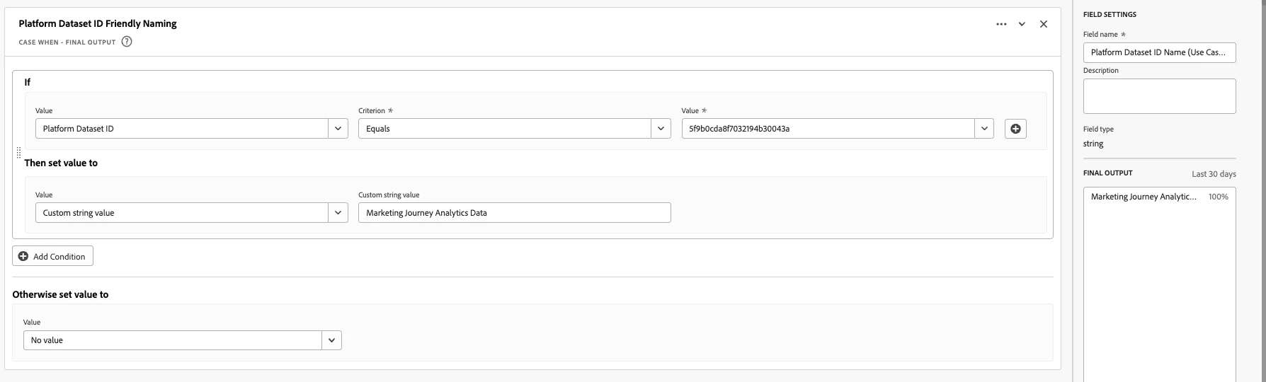 - Friendly Name Component Mappings: When a component's set values in CJA does not have a user-friendly or understandable reference, you can use the derived fields functionality to rename values into a new dimension. This can be a quick win with less overhead than managing via ingested lookups for small cardinality subsets of values in CJA. In the example below, using the standard field of Platform Dataset ID, derived fields allow for any custom string value friendly name identifier to be additively set as a component dimension. It is worth noting that this approach not only simplifies the management of CJA, but also enhances the user experience by allowing for more intuitive naming conventions. Additionally, by utilizing derived fields, users can more easily identify and understand the values being presented, which can lead to better decision-making and a more efficient workflow. Therefore, incorporating derived fields into your CJA strategy can be a valuable tool for improving both the management and user experience of your analytics data.