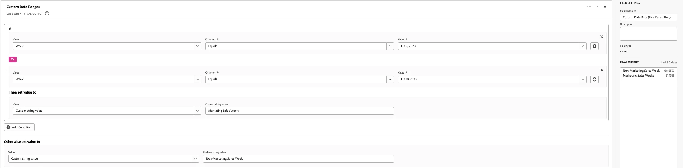 - Custom Date Ranges: Derived fields are a useful tool for working with CJA Standard Fields for time references. They allow you to create custom dimensions that are tied to specific custom date range criteria. Using derived fields, you can also specify all other time periods, giving you more flexibility when analyzing your data. In addition, derived fields can indicate specific date ranges that adhere to non-standard date parsing conventions. This includes date ranges with gaps that still need to be linked to aggregate. This enables you to better understand the relationships between different data points across time bounds and gain deeper insights into your data.