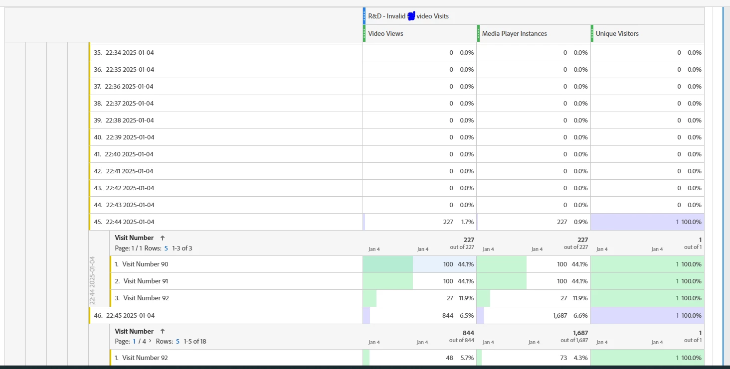 In the Adobe analytics report, we observed that for some mobile app users, we are seeing huge spike in the Video Views numbers. Its like within 1 minute seeing 900+ video views. It was random and happening very few times in a month. It was not bot activity but due to bug in the the mobile app.