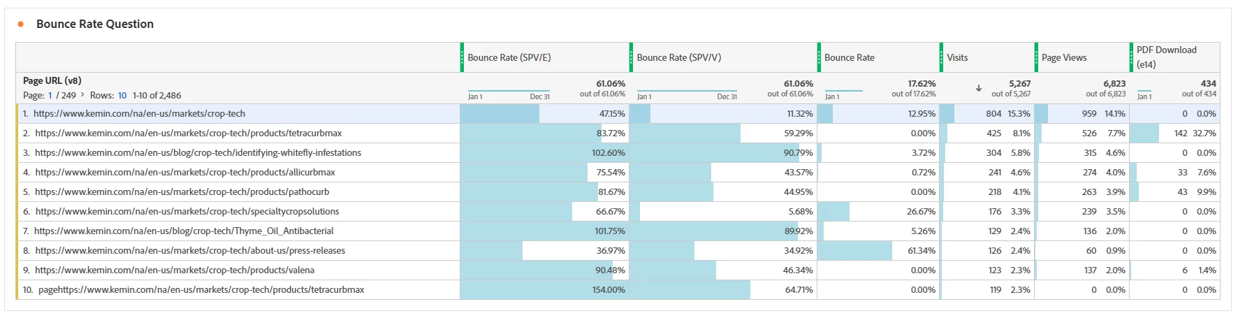 I added the following metrics to the table shown in the screenshot: Bounce Rate (SPV/E), Bounce Rate (SPV/V), and Bounce Rate. As you can see, the different bounce rate metrics vary greatly, so we are looking for some expertise on which to use. Usually, we use SPV/E when looking at visits; however, we are seeing bounce rates greater than 100%. This is what prompted me to examine the other bounce rate metrics, but they vary so greatly that I am looking for some expertise. I know the difference in what they calculate. (Singe Page Visits/Entries vs Single Page Visits/Visits). If the goal here is to just see the page URLs with the highest bounce rate, which is the accurate one to use for my instance? Image attached.