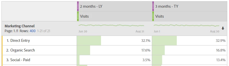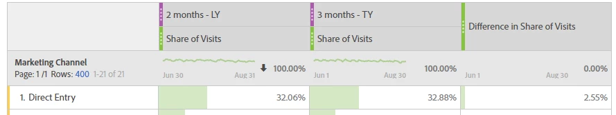 I have a table of visits split by channel. I have turned off numbers so that I can just see each channel as a % share of the total - I have this for TY and LY and am wanting to create a new column that will tell me the difference between the two percentages.