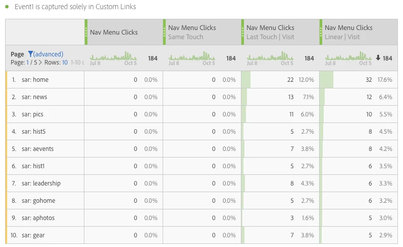 Here's a sample table I built that shows event1 which is only captured in Custom Links with 4 different attribution models applied to it:
