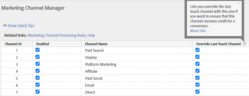 Hey @JayGr, The default ‘Marketing channel’ dimension functions identically to the ‘Last touch channel’ dimension only, so in a way, you are looking at the Last Touch Channel report. Yes, if hit 1 is Affiliate, but hit 3 is Direct, and you have override checked, in the same session channel would be overridden to direct. We can take a more deeper look of your setup and report, if you can log a support ticket to and we can cross validate this with the backend data as well and share more detailed analysis.