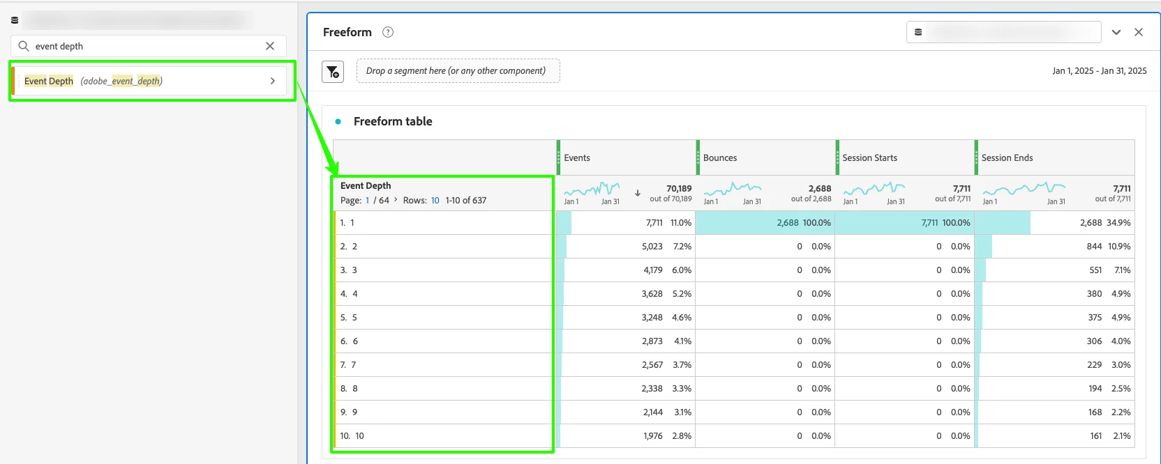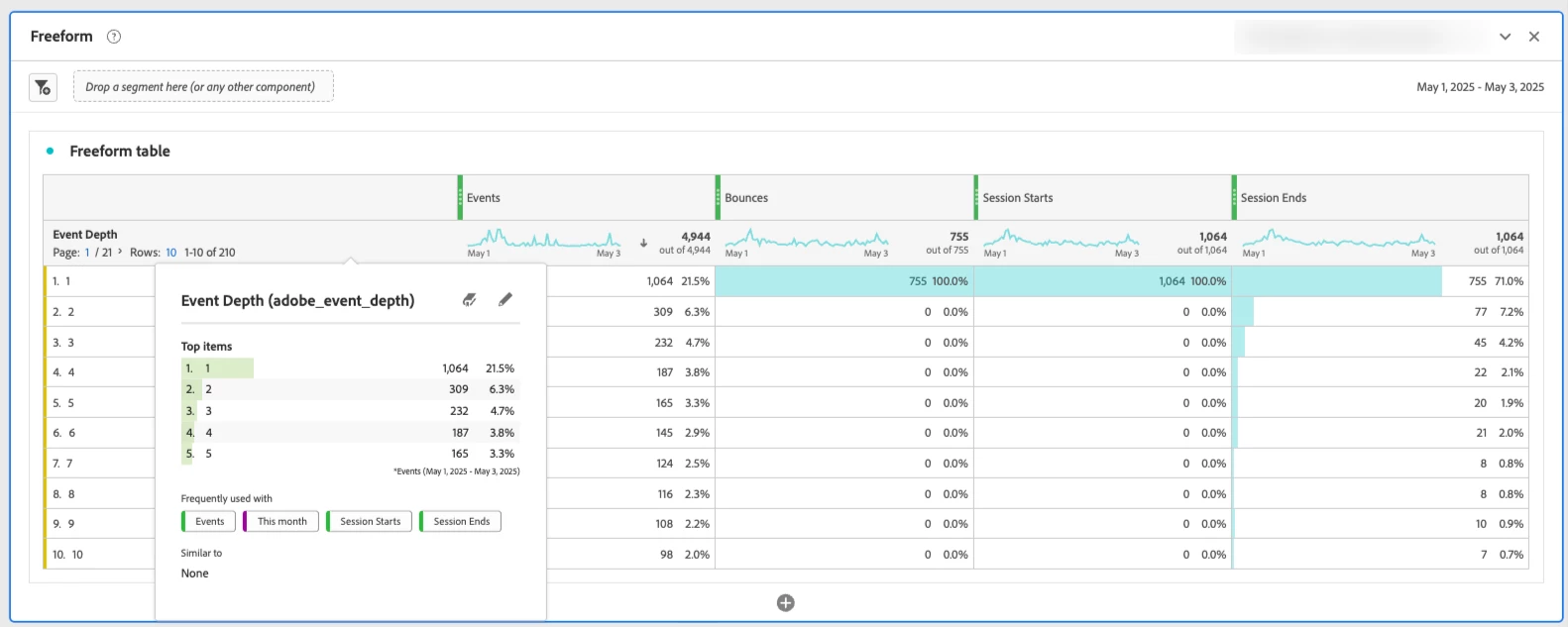 Event Depth marks a meaningful standard component advancement in CJA capabilities, giving organizations clearer visibility into event-based user session engagement patterns. This standard dimension component helps analysts better understand how users navigate touchpoints, interact with content, and progress through their customer journey. When used strategically, teams can uncover insights that reveal opportunities to optimize experiences, improve conversion funnels, enhance user interactions, and create better paths to increase user satisfaction across all platform touchpoints.