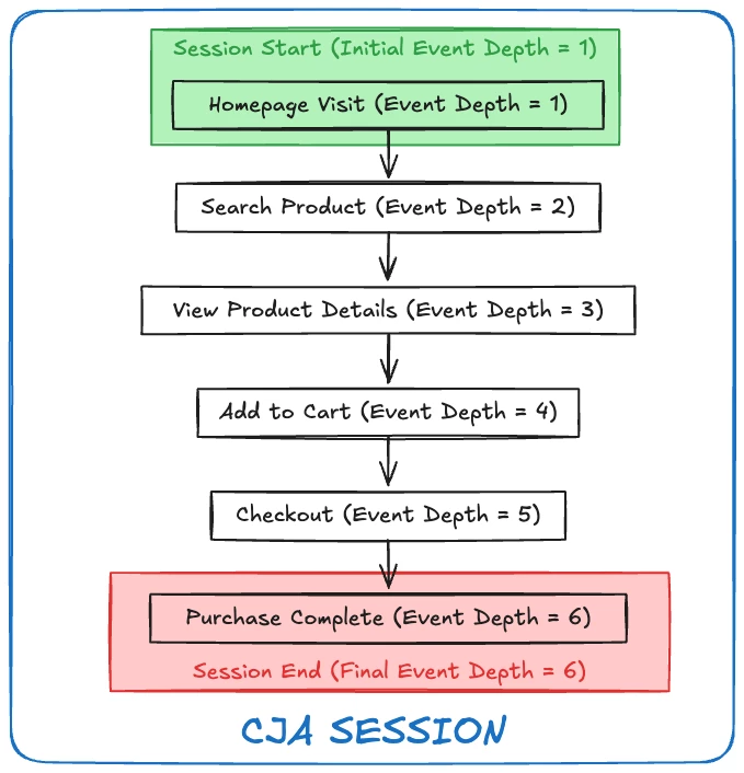 The diagram below illustrates how Event Depth increments with each user interaction within a single session. Starting from the session start beginning (Event Depth = 1), each subsequent interaction increases the Event Depth by 1. The final session end Event Depth value equals the total number of events in the session (Event Depth = 6), providing a clear measure of engagement depth.