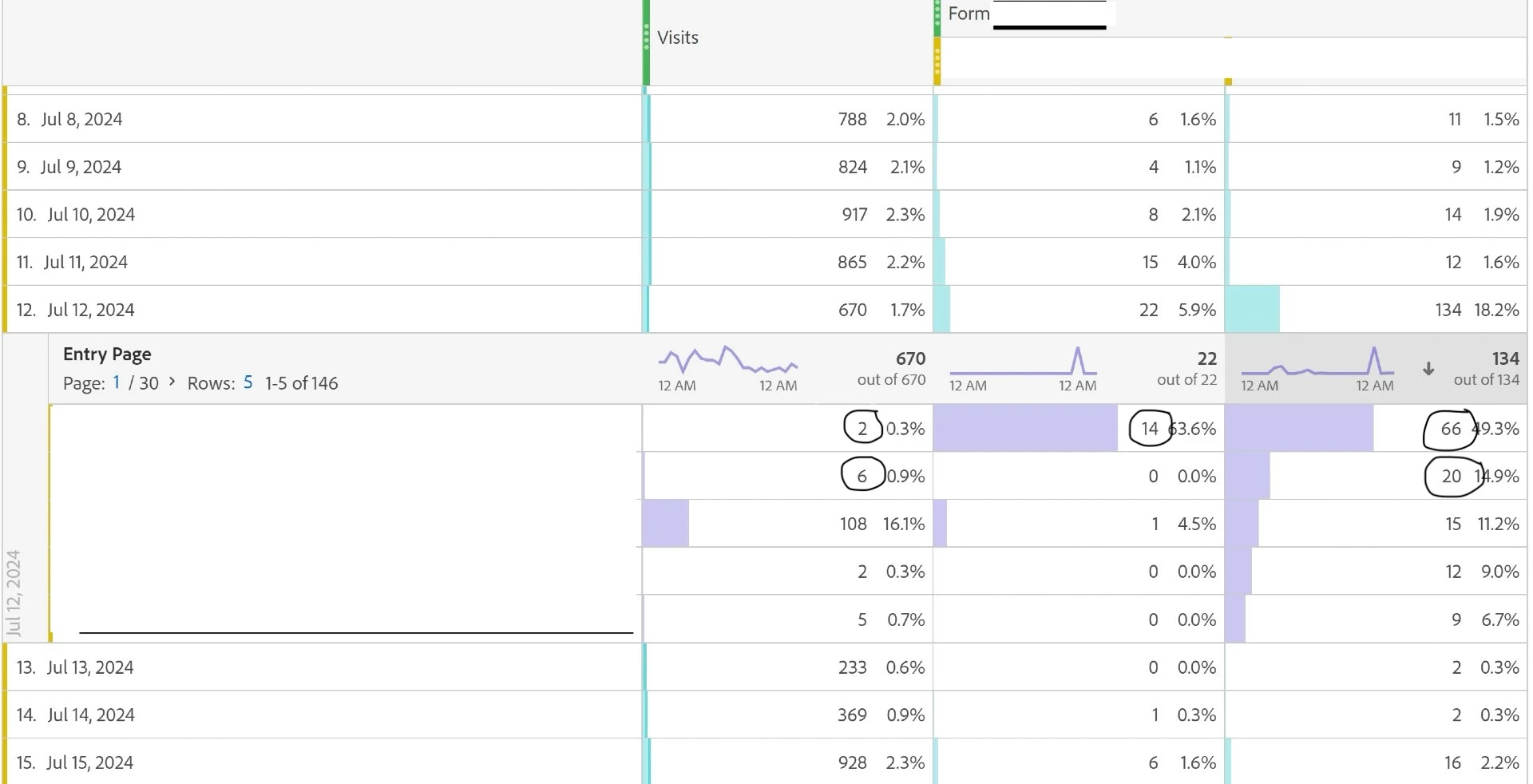 I’m facing an issue where the number of visits recorded for some entry pages is significantly lower than expected, yet the form completion numbers are disproportionately high. This discrepancy occurs consistently across multiple days, and I’m unsure what could be causing it. I observed that specific entry pages show very low visit counts on certain dates, but the corresponding form submission numbers are much higher. I have attached anonymized screenshots of the data to illustrate the problem.