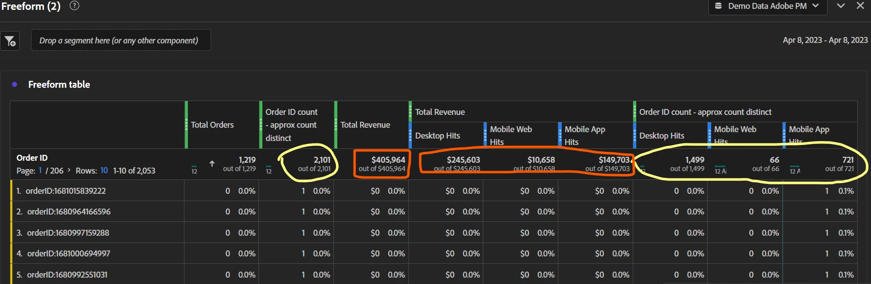 I'm also wondering how you can have "0 Total Orders" in the first few rows, but have an approx distinct order id count... the row clearly shows an order id....