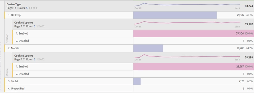 Please see the report below. It seems that Adobe Analytics data is captured only when Cookie Support is enabled ? Is this standard or can be changed ?