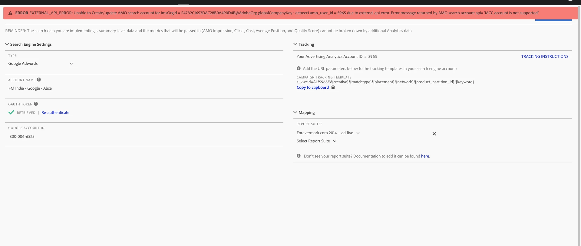 Hi, we hold an Adobe Analytics Prime account? However, when trying to create an 'advertising account' under 'advertising analytics' to integrate data from our Google Adwords account, it gave an error -
